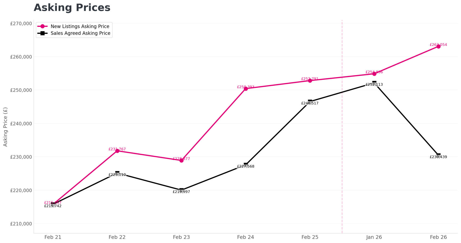 The pricing picture across Denbighshire, Flintshire, and Conwy is one of the most encouraging aspects of this February's data. Average asking prices for new listings stand at £263,054, representing a meaningful 4.1% increase on last February's £252,791 and a 3.2% rise from January's £254,836. These are not marginal movements. They represent genuine year on year growth that puts the region firmly into positive territory after a period of relative price stability.