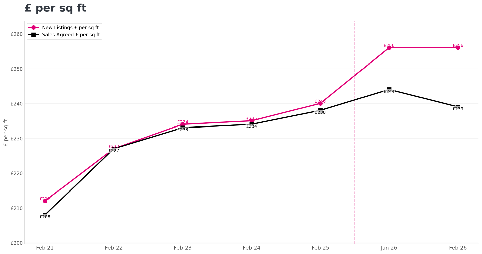 The price per square foot figure of £256 reinforces this confidence. It has risen 6.7% from last February's £240 and matches January's level exactly, suggesting that the uplift in values is being sustained rather than representing a one month anomaly. This is the highest February price per square foot figure in the six year dataset, and it tells us that sellers and their agents are pricing with confidence that is being validated by buyer interest.