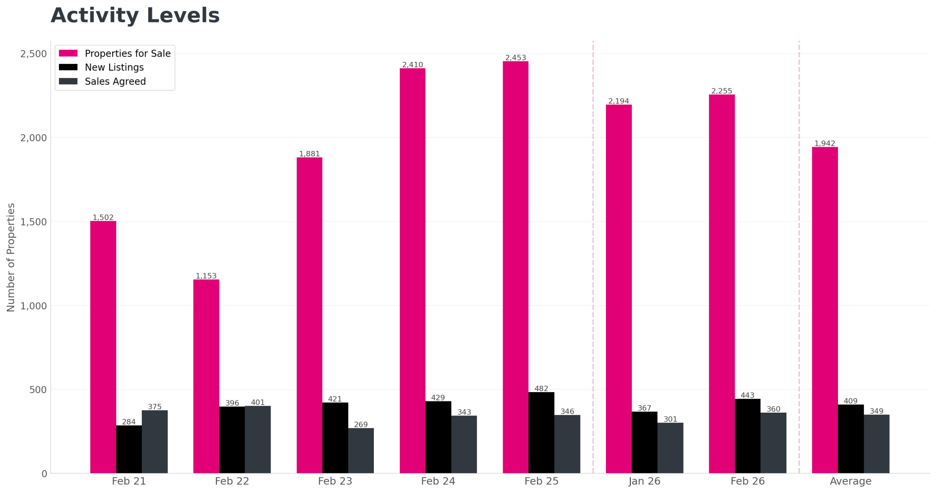 Month on month, stock has edged up modestly from 2,194 in January to 2,255 now, a 2.8% increase that aligns with normal seasonal patterns as fresh spring listings begin to arrive. This gentle monthly growth, set against the year on year decline, suggests that the market is finding a more sustainable equilibrium between supply and demand.