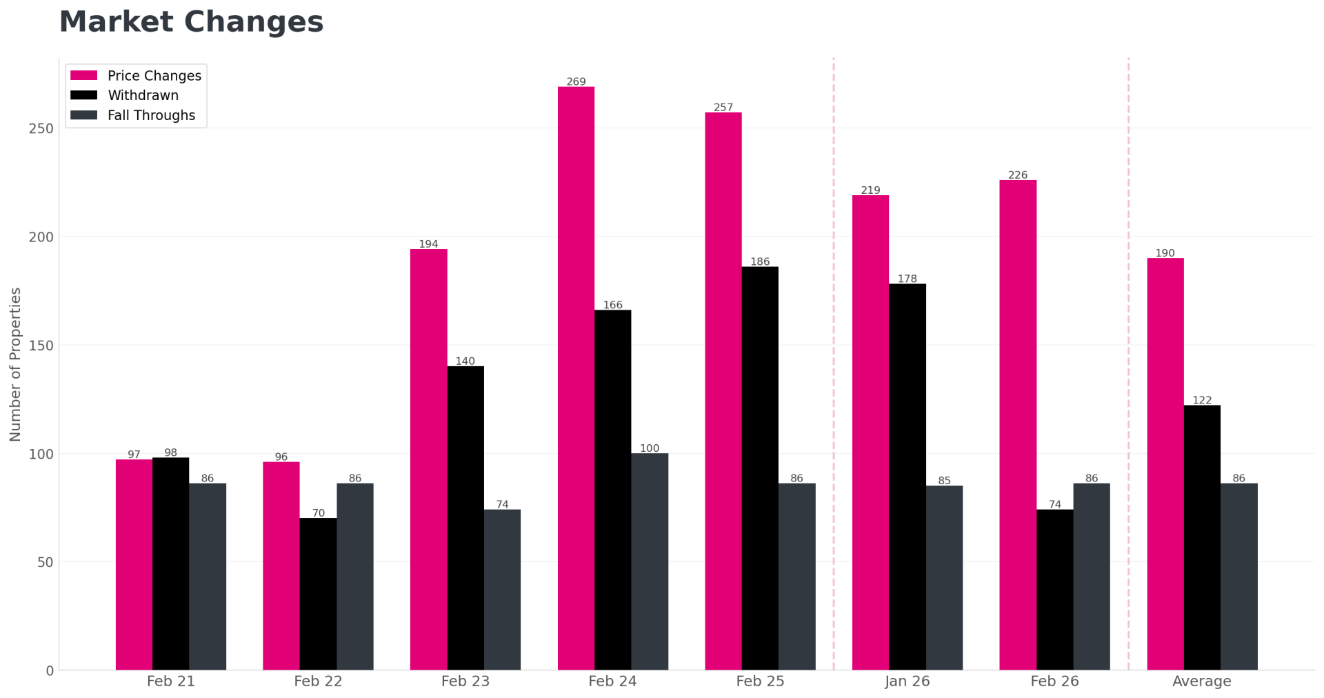 Price reductions in February came in at 226, down 12.1% from last year's 257 and a modest 3.2% increase from January's 219. Against the six year average of 190, reductions remain elevated at 18.9% above, but the direction of travel is clearly improving. The peak of repricing activity, which saw 269 reductions in February 2024, appears to have passed.